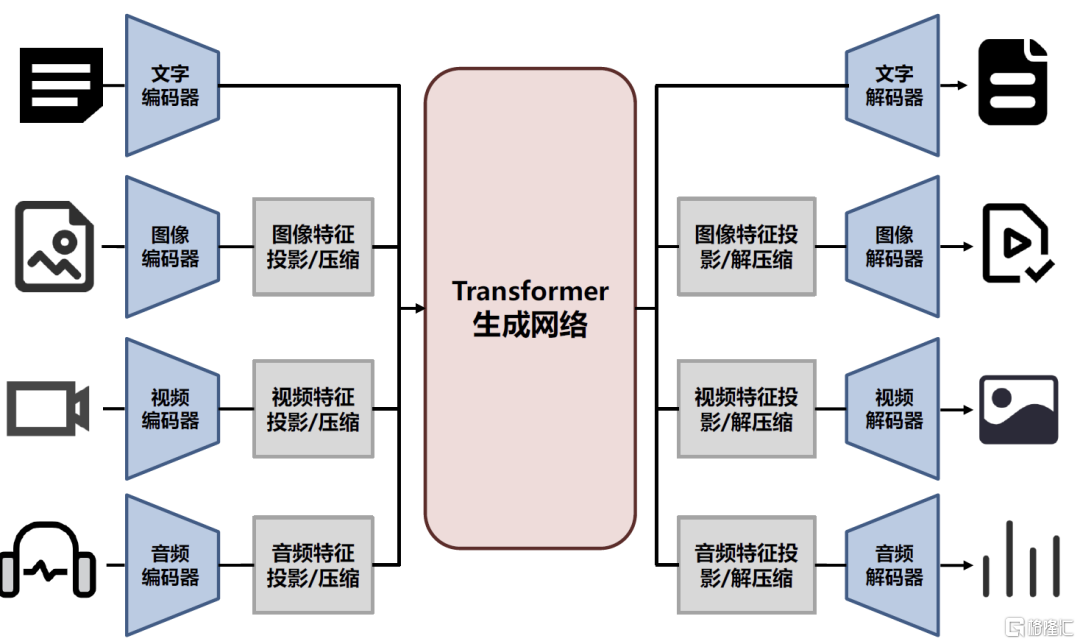 多模态大模型的一种典型架构:各模态的编解码器+投影/压缩网络+生成网络。对于多模态大模型的架构,过去数年来产业界也尝试了多种路线的探索,其中一种较为典型的架构如下图所示,主要由三部分构成。