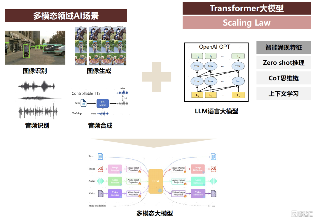 产学研界旨在多模态领域“复刻”大模型在语言的成功。在过去数年中,以Transformer作为架构核心的LLM已经在文字模态领域取得了显著成果,“Scaling Law”持续得到验证,大模型在语言领域呈现出了初步“智能涌现”的特征;因此产业也开始愈发关注如何基于在语言单模态领域LLM的成功经验,将Transformer引入至图像、视频等更多模态的任务场景中,充分发挥Transformer大模型的可扩展性,使“Scaling Law”能够在更多的模态领域得以发挥,最终在多模态领域复现出LLM大模型的“智能涌现”。