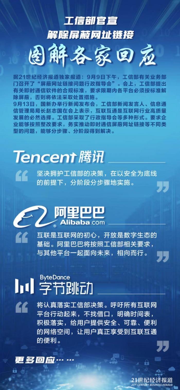 阿里巴巴回应,互联是互联网的初心,开放是数字生态的基础。阿里巴巴将按照工信部相关要求,与其他平台一起面向未来,相向而行。