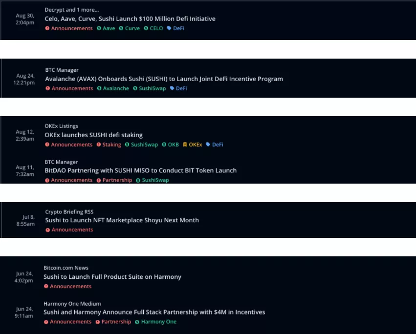 利用The TIE专有的SigDev feed,我们可以看看SushiSwap团队在过去几个月中最值得注意的一些事件。伴随着下一代AMM Trident和NFT市场Shoyu的发布,团队一直在努力整合并与其他L1解决方案形成合作关系。