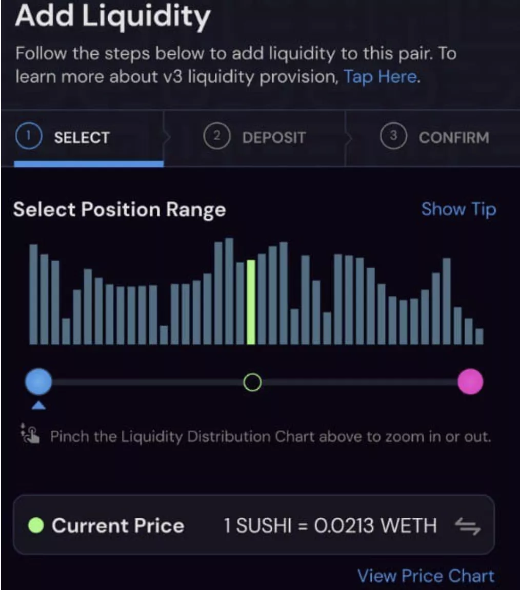 如图所示,流动性提供商将能够选择他们希望收取平台费用的代币价格范围。这是希望你需要与其他供应商分享的池子的数量能在几个范围内更均匀地分布,在你选择的范围内为你提供更大的一块蛋糕,这意味着更高的费用积累。对于集中的流动性池,最终的好处是,它将允许流动性提供者更窄的范围提供流动性,以最大限度地分享他们从整个SUSHI的平台互换费用中获得的收入。
