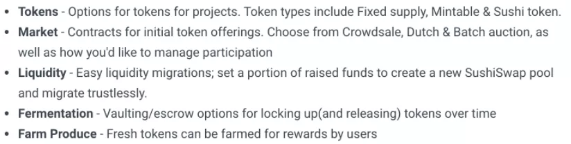 MISO背后的想法是为项目提供一个直接的途径来启动代币,并为SushiSwap生态系统本身推动更多的配对和流动性。通过提供一个平台来实现这一点,有利于Sushi提供的整套产品,为代币的生命周期创造一个完整的生态系统。MISO平台本身也提供了一套被称为 "成分(Ingredients) "的开源合同,团队可以使用这些合同,以安全、经过测试的方式提供一个执行良好的IDO。所提供的工具分为以下几类: