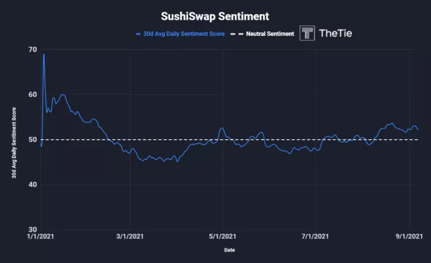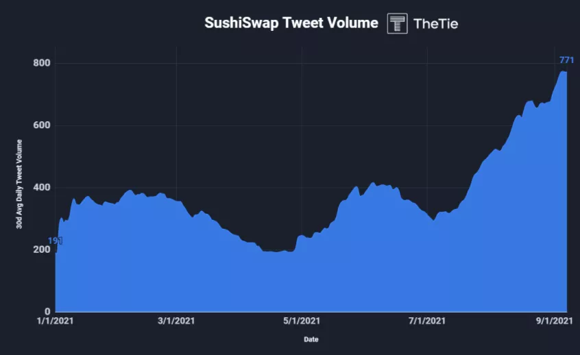 我们可以看到围绕Sushi的推特量与该项目情绪之间形成了一种的关联。Trident协议是在2021年7月下旬宣布的,我们可以看到对推特量和所有情绪的直接影响,我们可以假设这在很大程度上是由于这一宣布以及一系列其他重大事件,如对其他第一层链的跨链整合。
