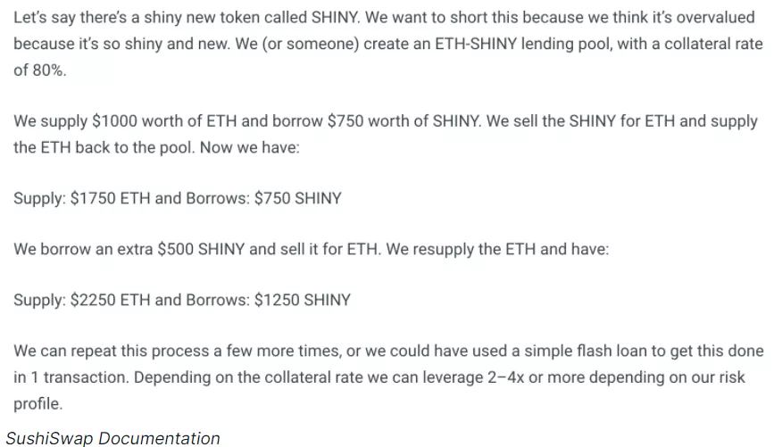 此外,在使用孤立的借贷池和闪电贷款的同时,这些池子可以用来创建链上的杠杆空头,如SushiSwap文件中所述: