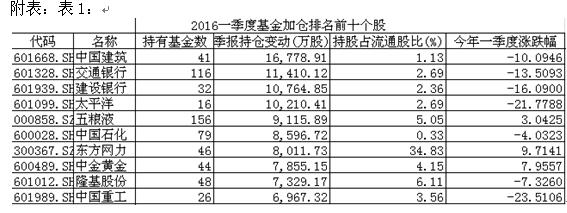 随着基金一季度报的出炉,基金重仓持股名单也随之曝光。其中,中国建筑一季度被基金增持16778.91万股,数量最多,交通银行、建设银行紧随其后,基金加仓数量也在1亿股以上。同为银行股的民生银行、兴业银行、北京银行、工商银行等则待遇截然不同,一季度基金公司持仓同比减少1亿股以上。