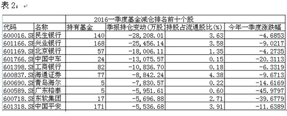而在被基金“抛弃”的个股中,银行股成为重灾区,在一季度基金减仓排名前十的上市公司中,银行股占据了4只,其中民生银行、兴业银行、北京银行是基金减仓最多的三位,分别被减仓28208.01万股、25456.14万股和18006.11万股,此外,工商银行排名第五,一季度基金减仓10836.7万股。