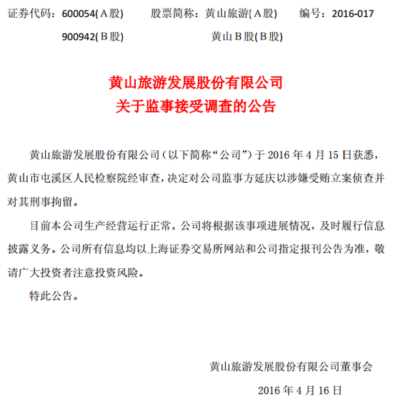 中国证券网讯黄山旅游[股评]4月15日晚间公告称,公司于4月15日获悉,黄山市屯溪区人民检察院经审查,决定对公司监事方延庆以涉嫌受贿立案侦查并对其刑事拘留。同时黄山旅游表示,目前公司生产经营运行正常。