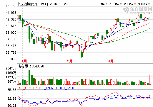 比亚迪H股早盘一度涨潮7%,收盘涨4.94%,报44.65港元,其A股跌2.03%,报56.87元。